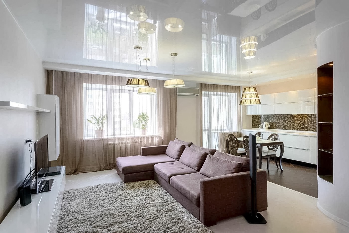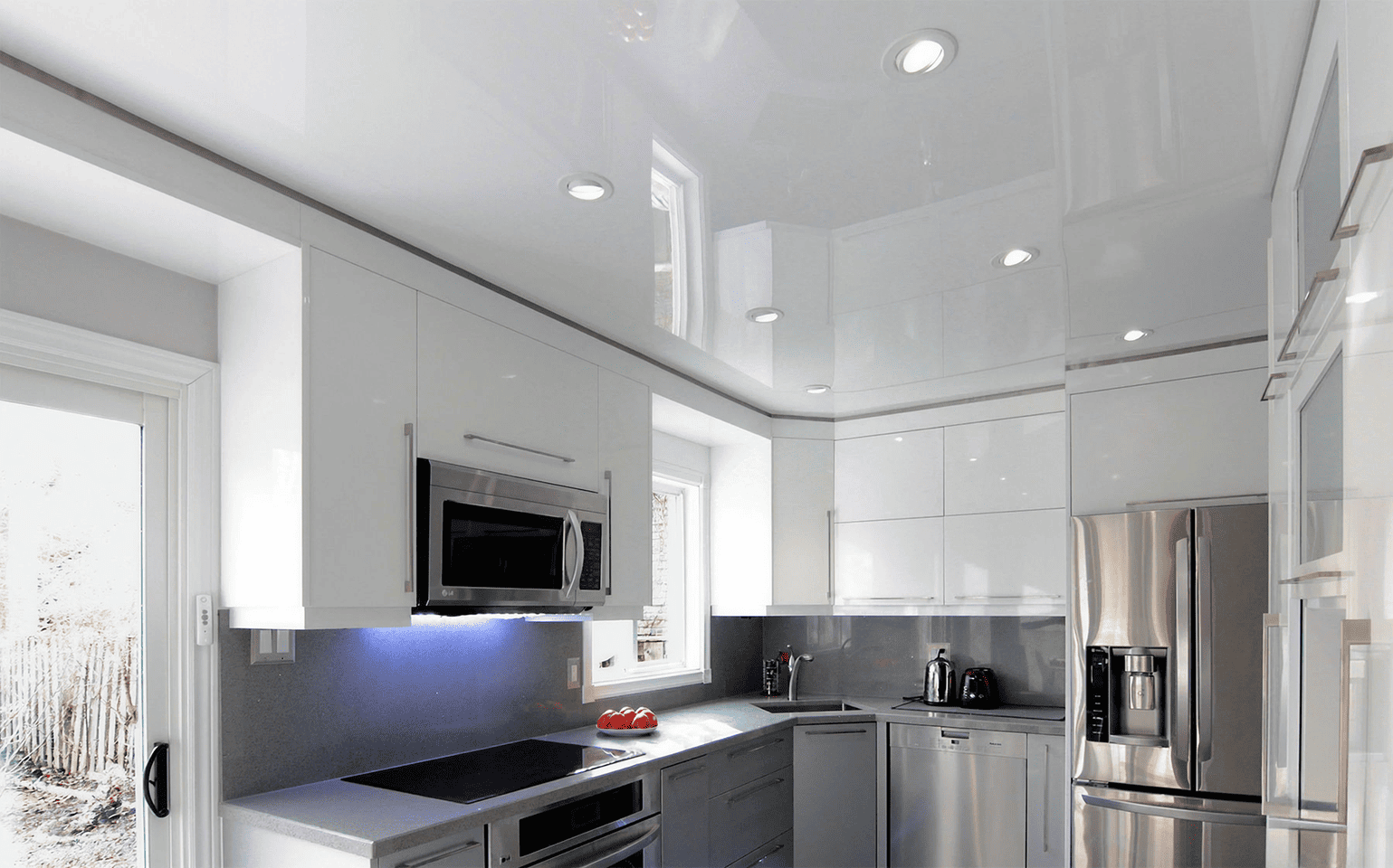 Глянцевые потолки придают помещению светлое и просторное ощущение, а также маскируют недостатки и сложности в его форме и конструкции.