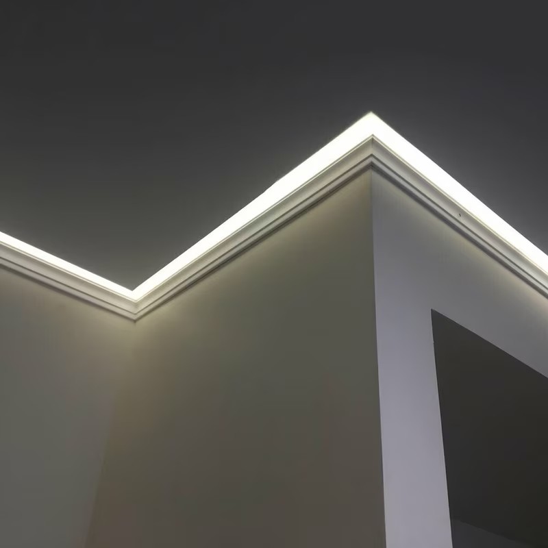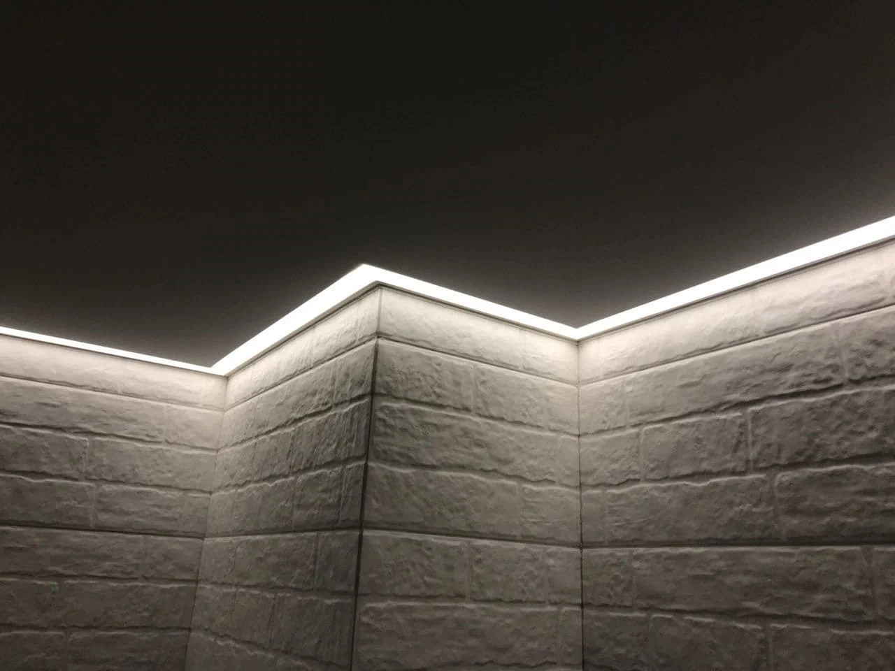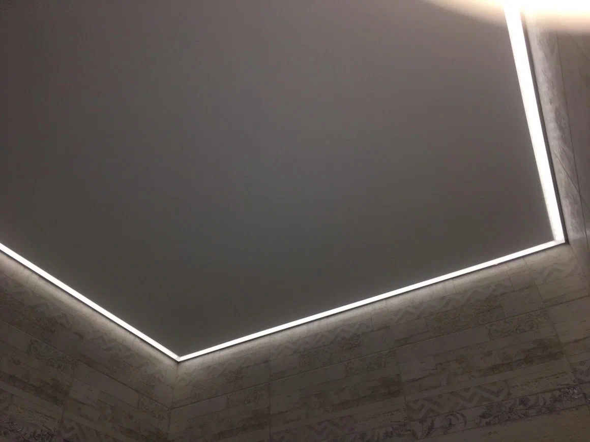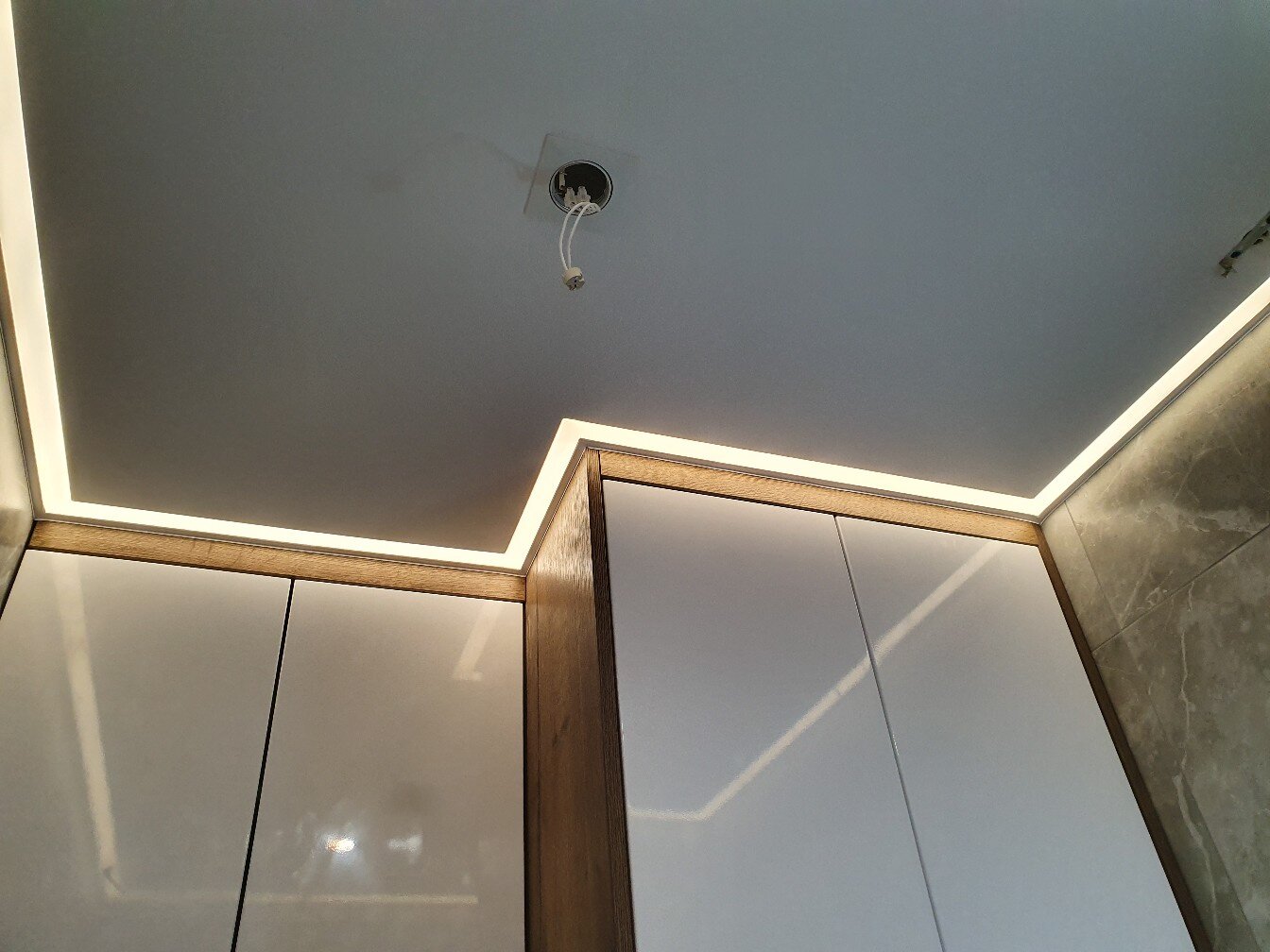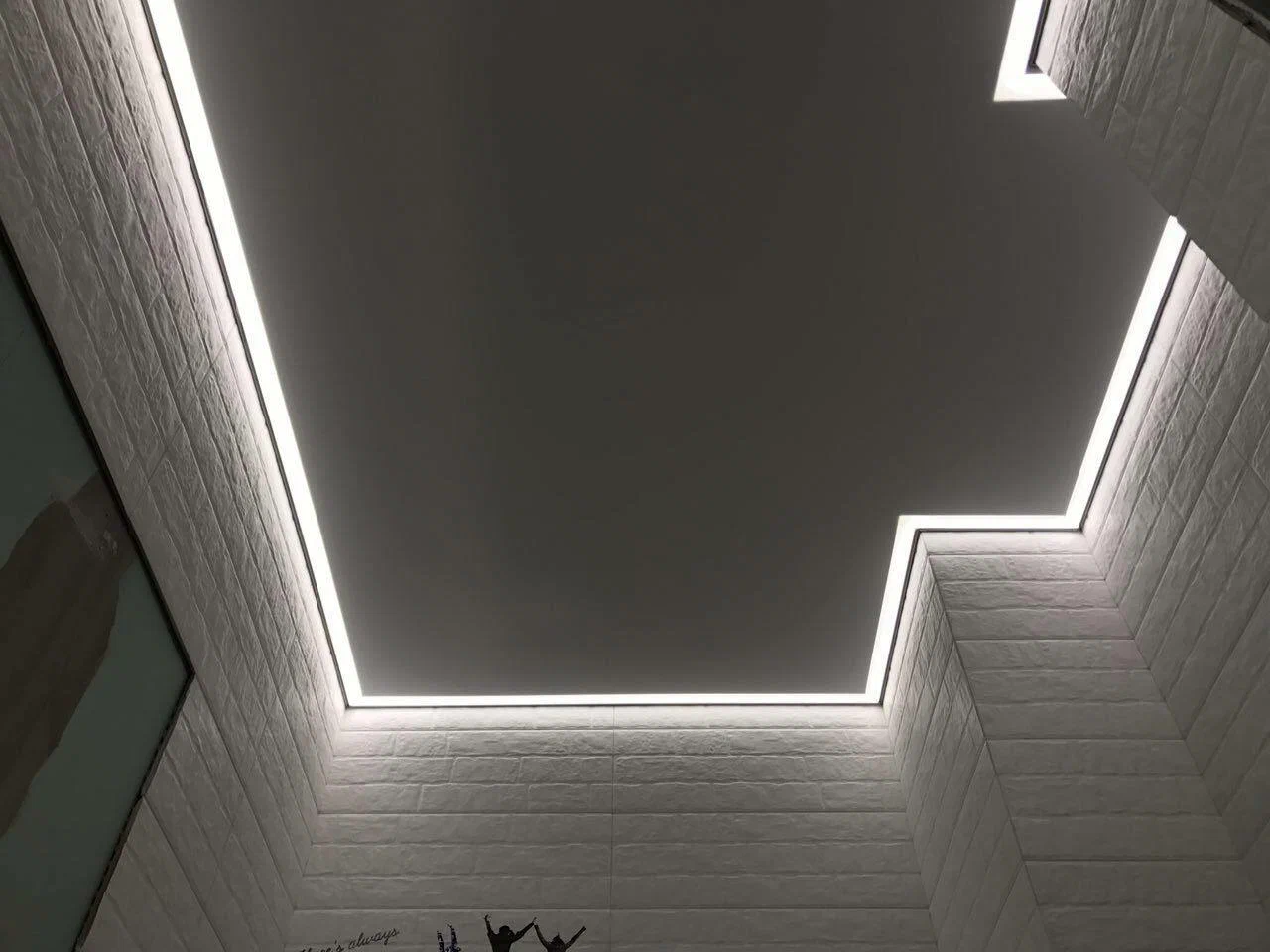 Контурный потолок устанавливается по периметру комнаты: светодиодная лента мягко просвечивает сквозь полотно, а профиль формирует чёткий световой контур, подчёркивающий стиль интерьера.