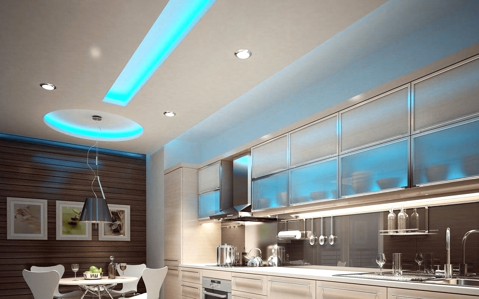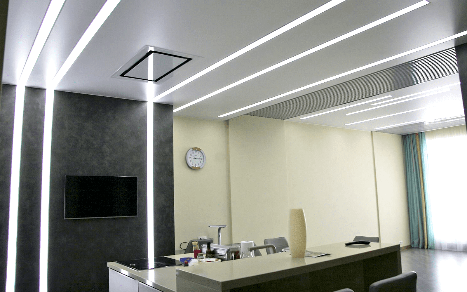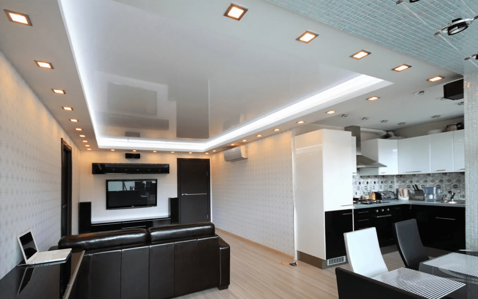Натяжные потолки подходят для установки различных осветительных приборов, включая встроенные светильники и светодиодные ленты. Правильное освещение в квартире играет важную роль, и натяжные потолки позволяют создать равномерное и комфортное освещение в каждой комнате.